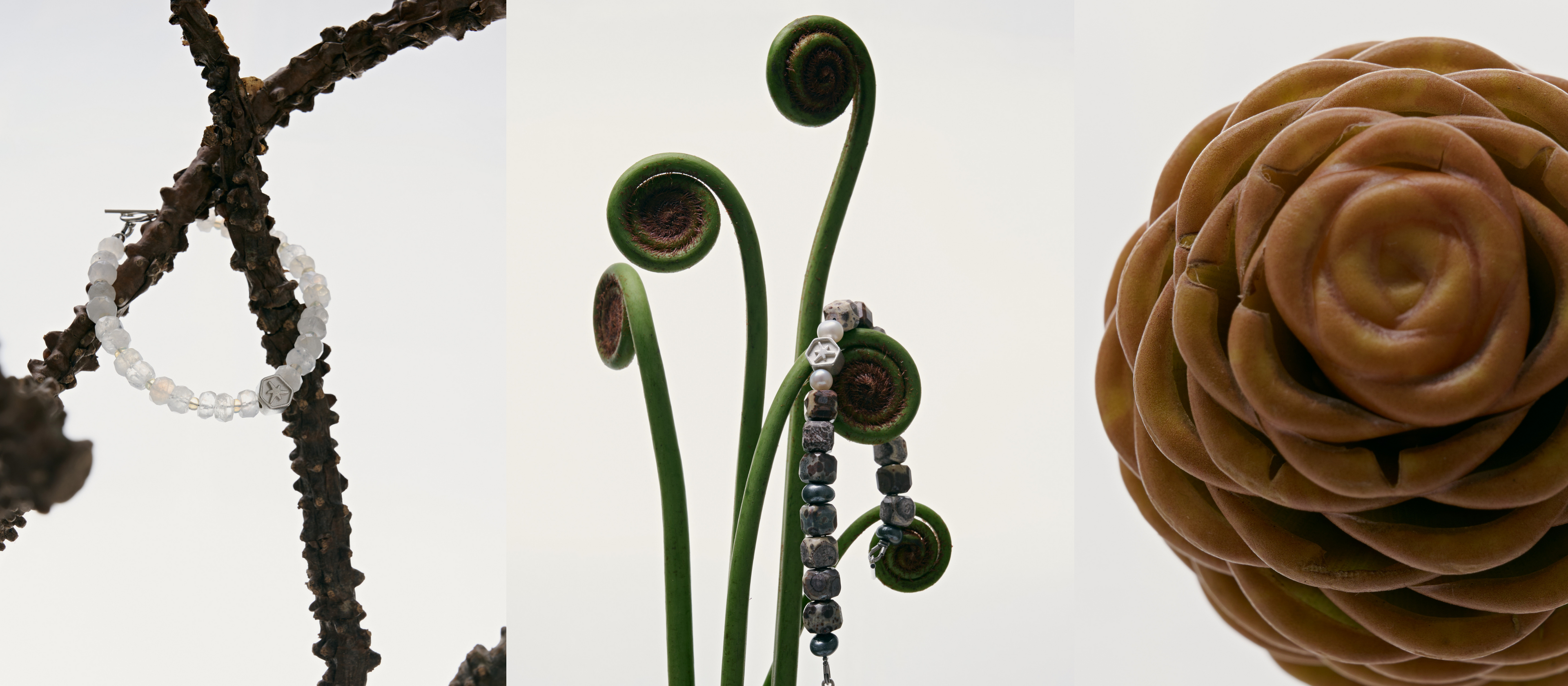 以礦石結合多元材質,創造出帶有自然與當代設計質感的吊飾