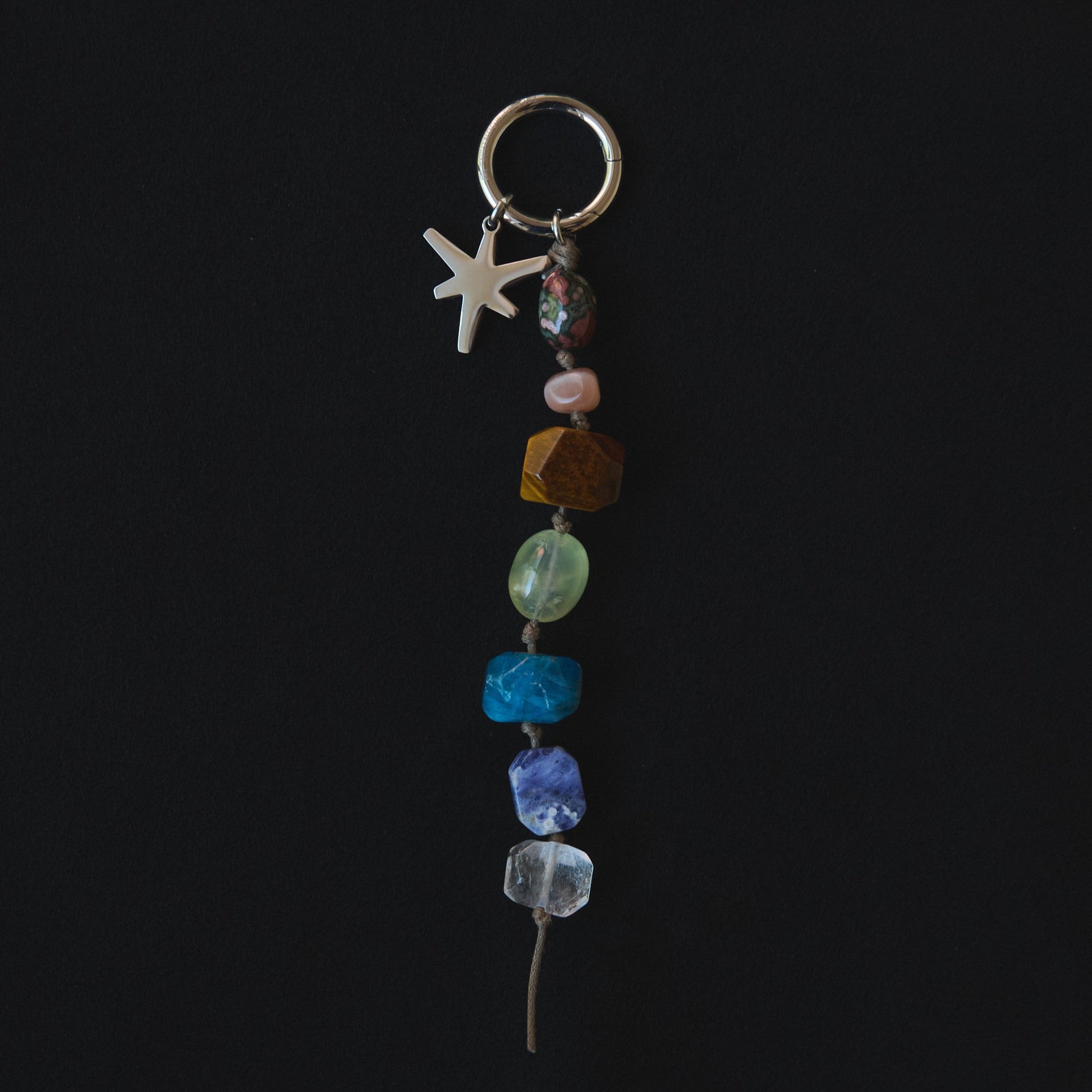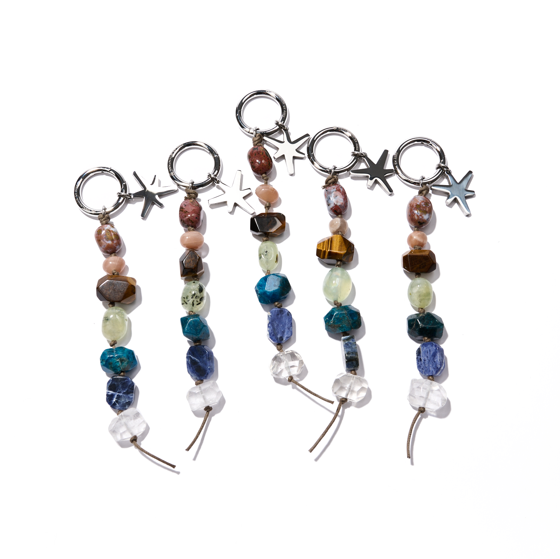 設計概念:七顆色彩鮮明的天然寶石,如同懸浮於宇宙的彩虹星球,象徵著七種能量場域。每一款皆搭配山托邦品牌標誌北極星吊墜與品牌訂製不鏽鋼扣環,刻有 Free As Mountains,觸感光滑細緻,傳遞自由與守護。
