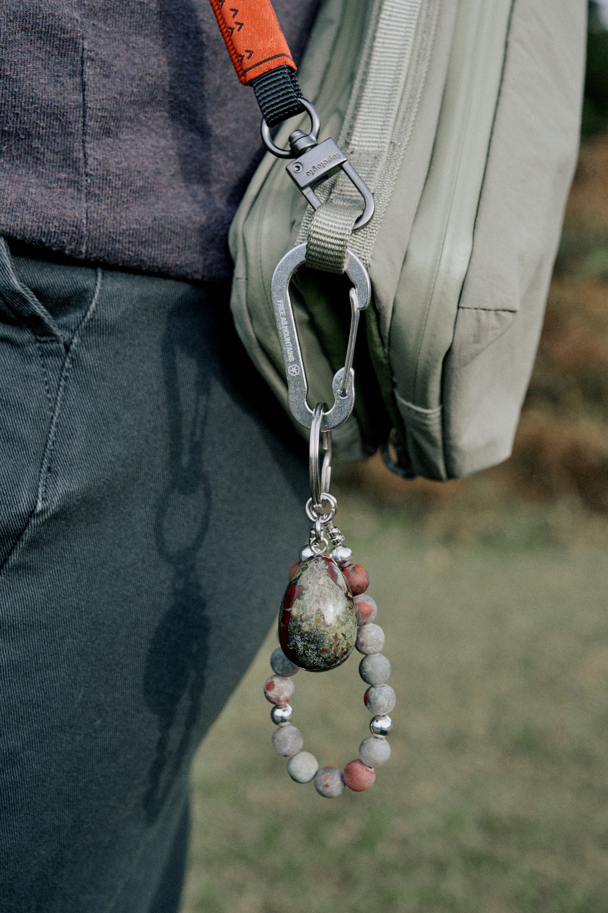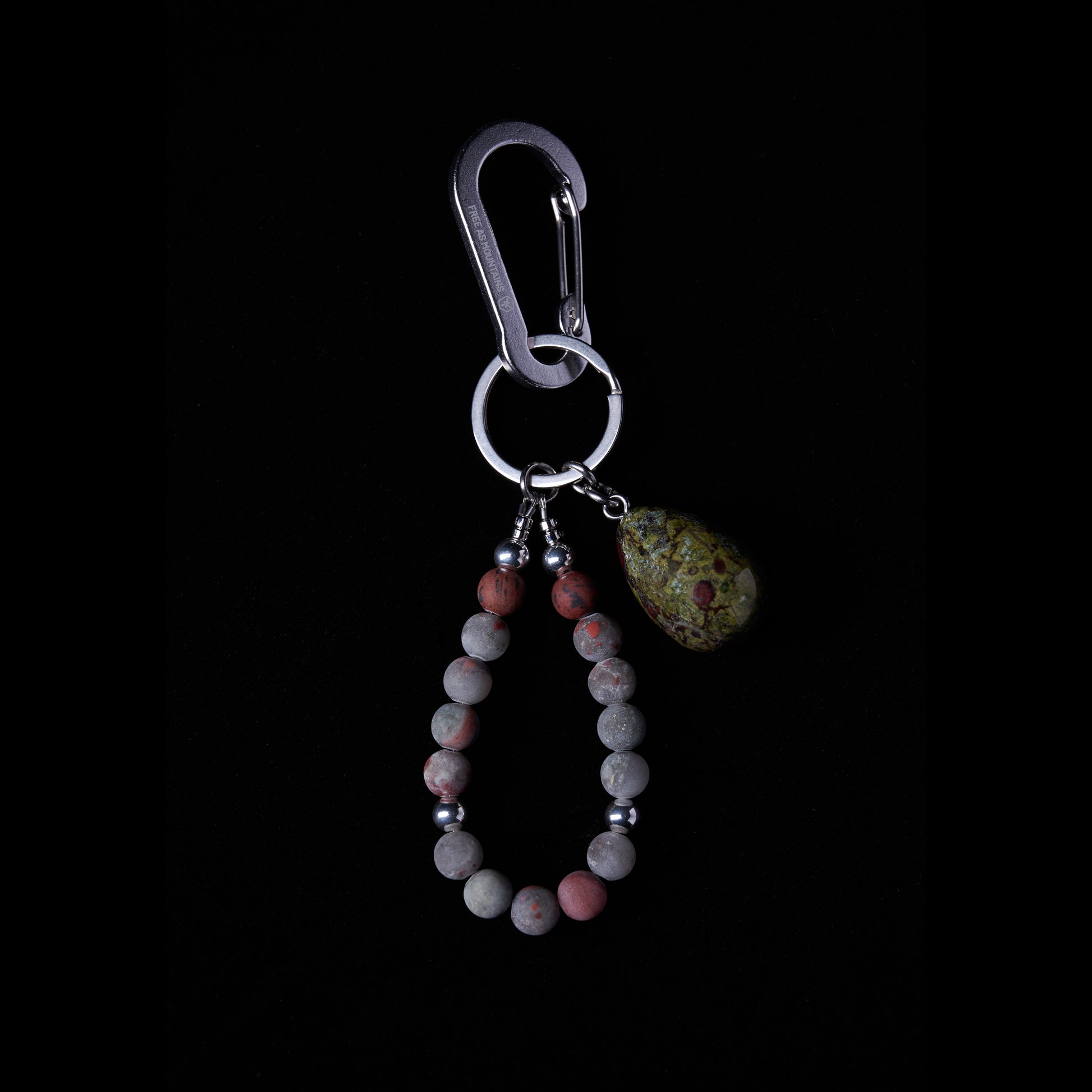 這款小龍蛋鑰匙圈以龍血石為主材質,搭配赤鐵礦、非洲血石與紅曜岩打造而成。蛋型設計象徵堅韌的生命力與突破的勇氣。龍血石鮮明的紅綠紋理蘊含深厚的保護與再生能量,赤鐵礦穩定根基,非洲血石平衡情緒,紅曜岩增添熱情行動力,每一天注入無盡能量。