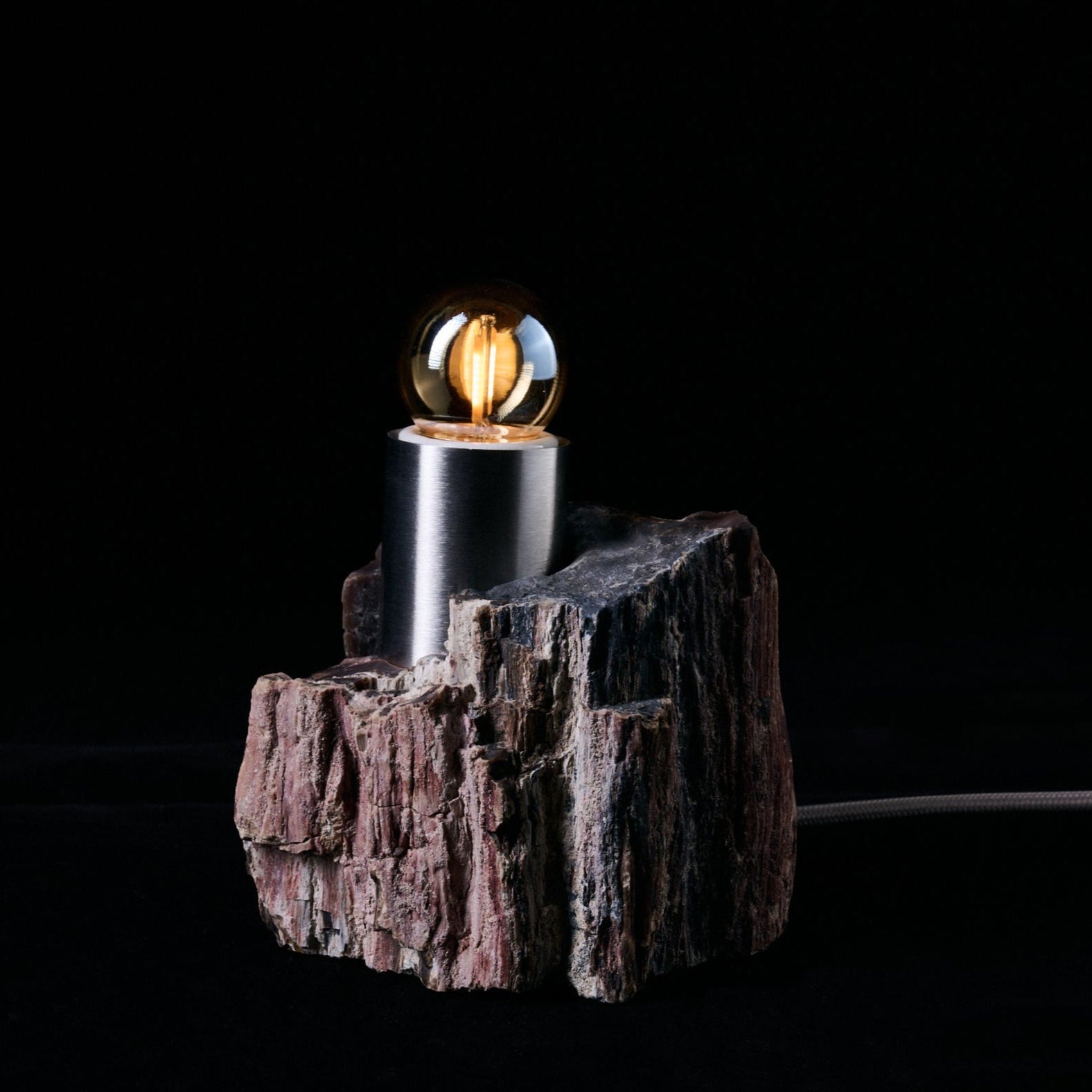 使用木化石原礦製作,石面帶有如年輪般的沉穩紋理,彷彿凝結了時間流動的痕跡。木化石源自數千萬年前的古老樹木,在地質變動與火山灰覆蓋的環境中,歷經長時間礦物滲透與矽化作用,逐漸由有機物質轉化為礦石,礦石表面仍保留了木材的結構與紋理。