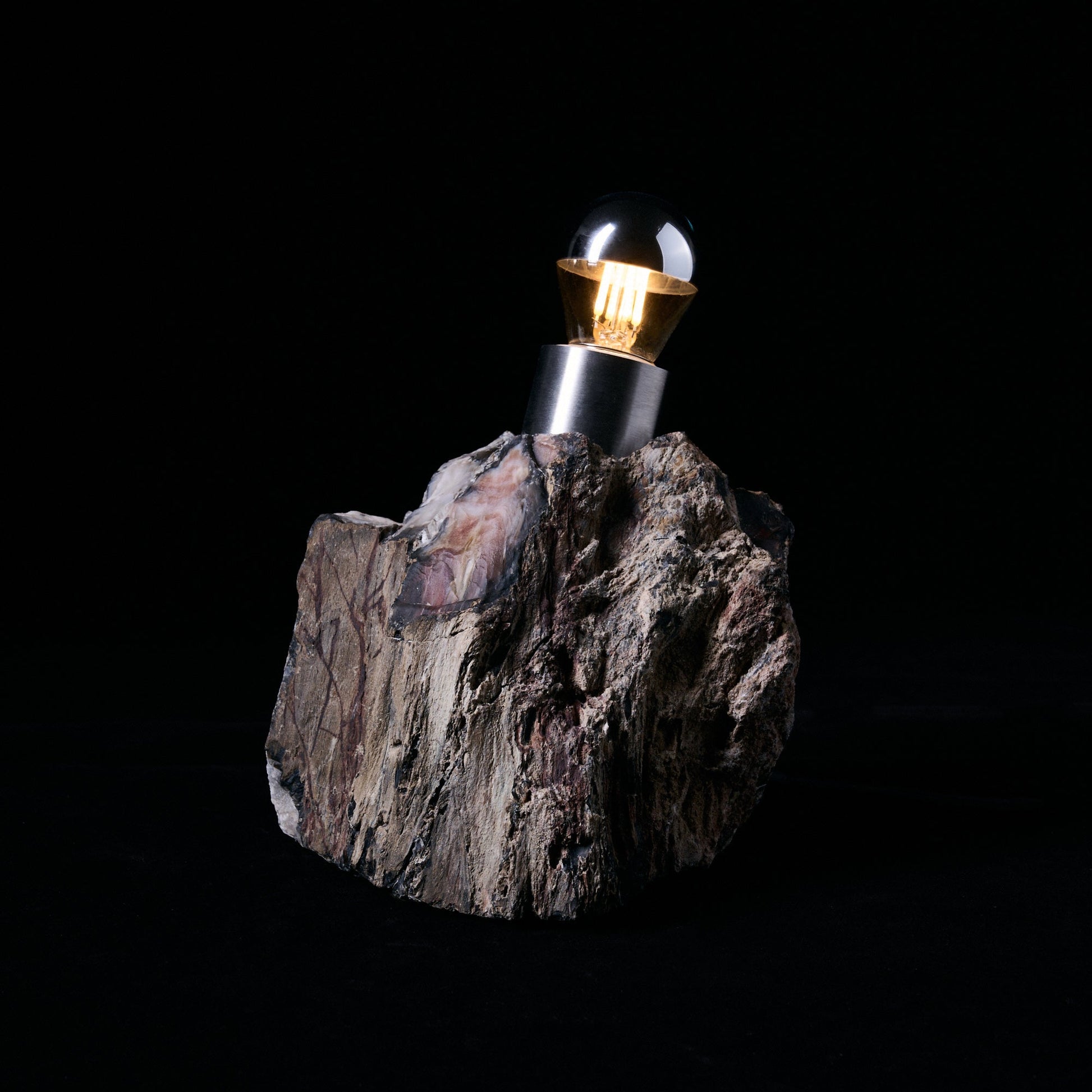 使用木化石原礦製作,石面帶有如年輪般的沉穩紋理,彷彿凝結了時間流動的痕跡。木化石源自數千萬年前的古老樹木,在地質變動與火山灰覆蓋的環境中,歷經長時間礦物滲透與矽化作用,逐漸由有機物質轉化為礦石,礦石表面仍保留了木材的結構與紋理。
