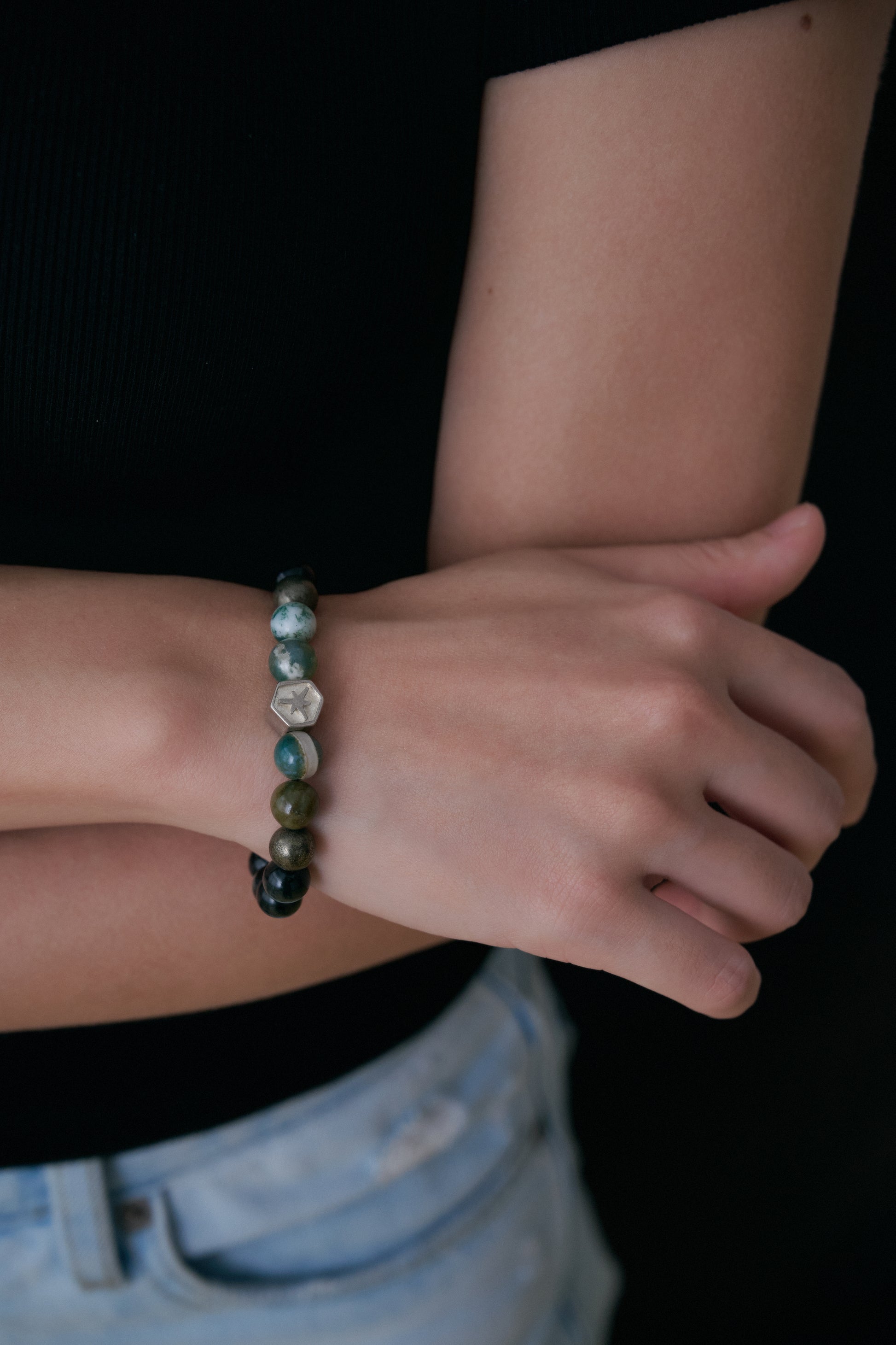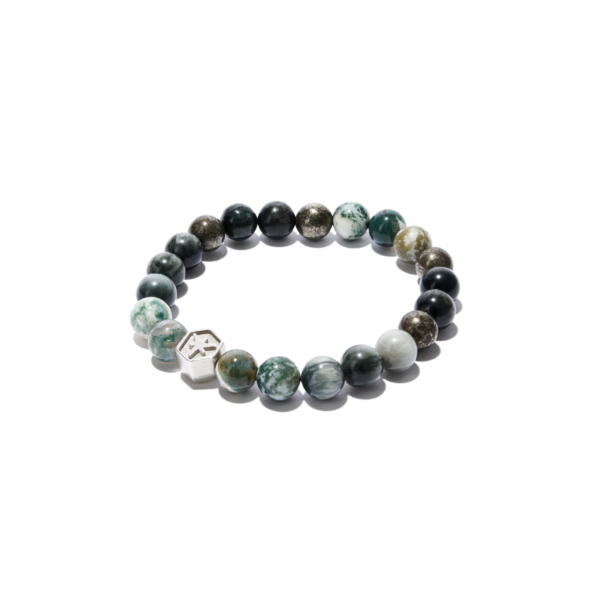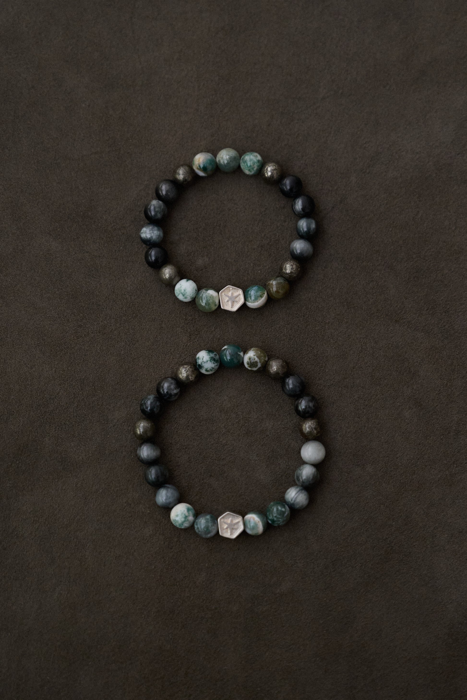 材質:樹紋瑪瑙、黃鐵礦、鷹眼石、Mountopia 北極星標誌 925銀飾、彈性絲線