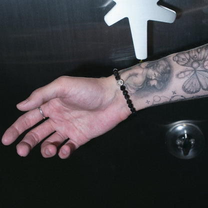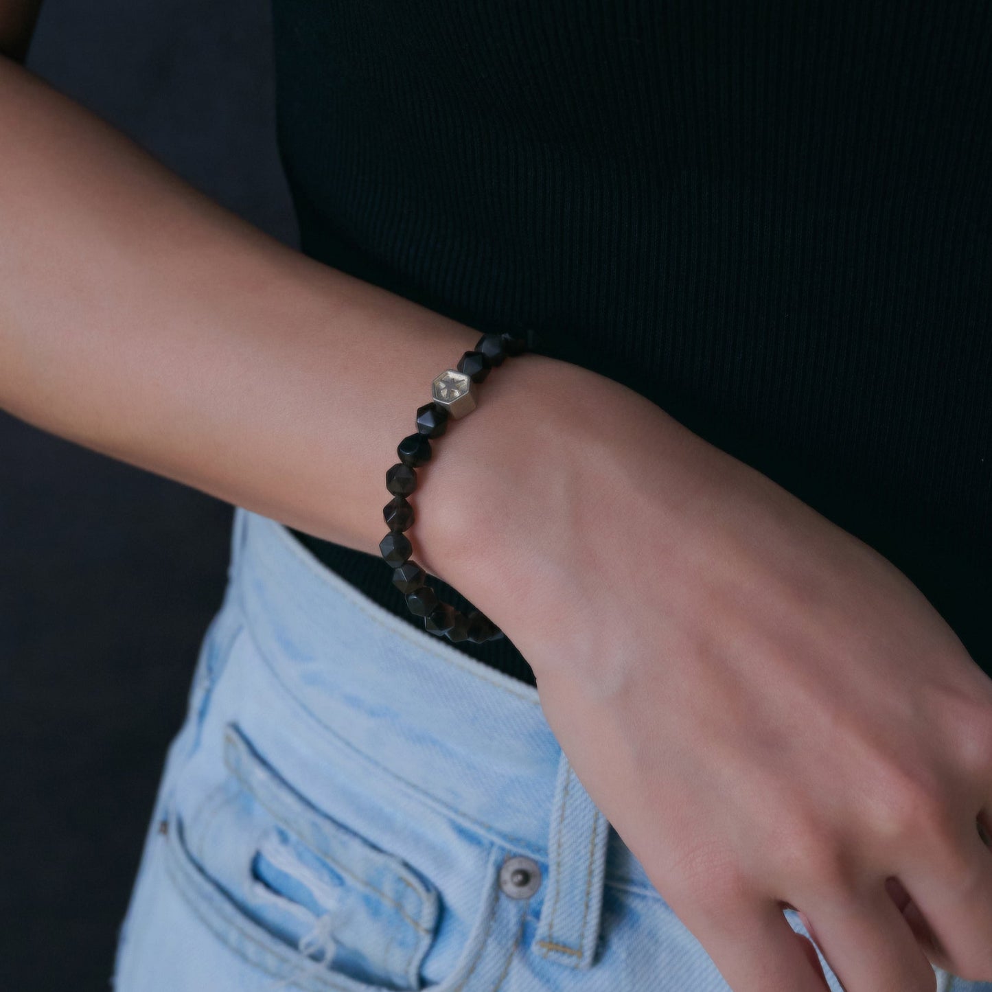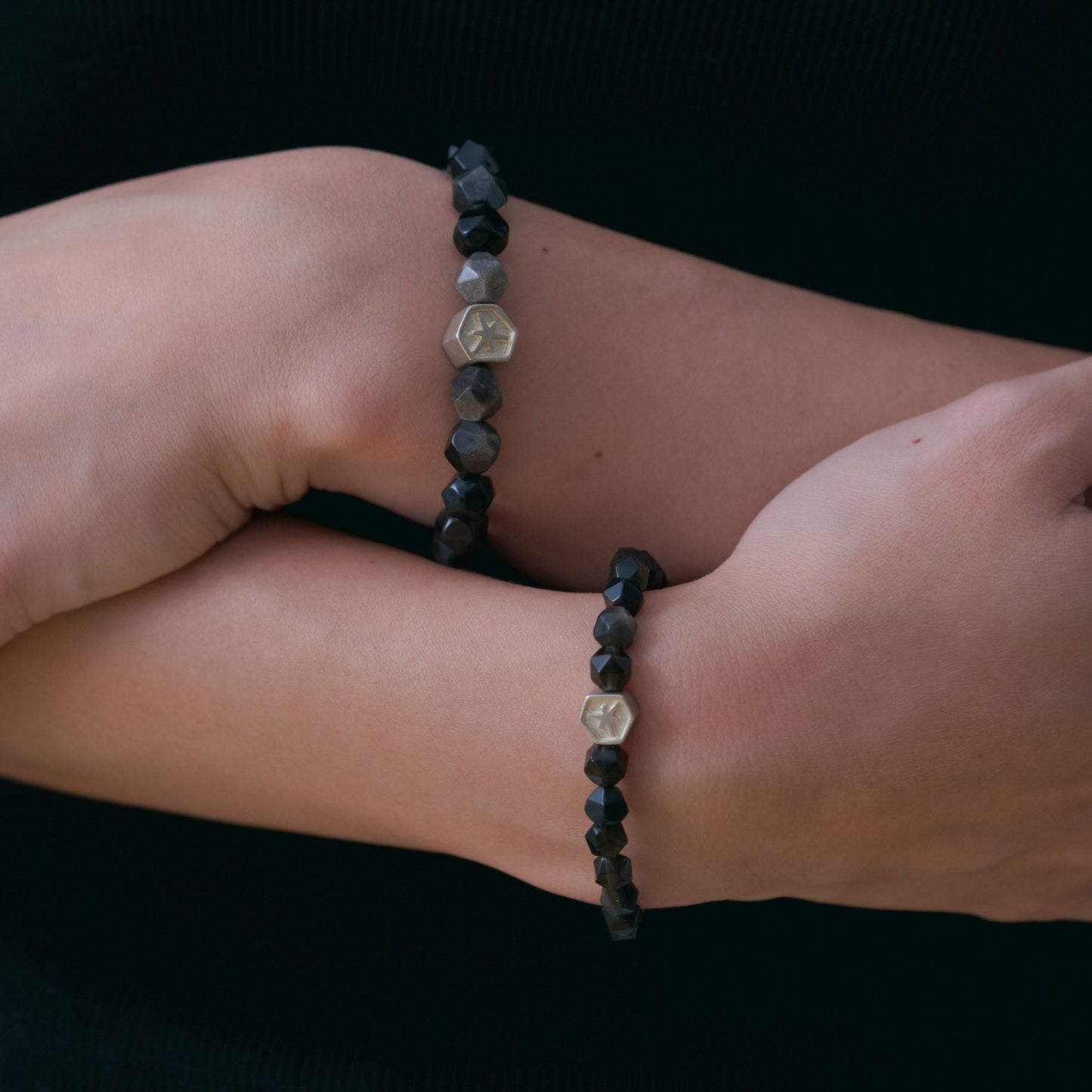 材質:銀曜石、赤鐵礦、Mountopia 北極星標誌 925銀飾、彈性絲線