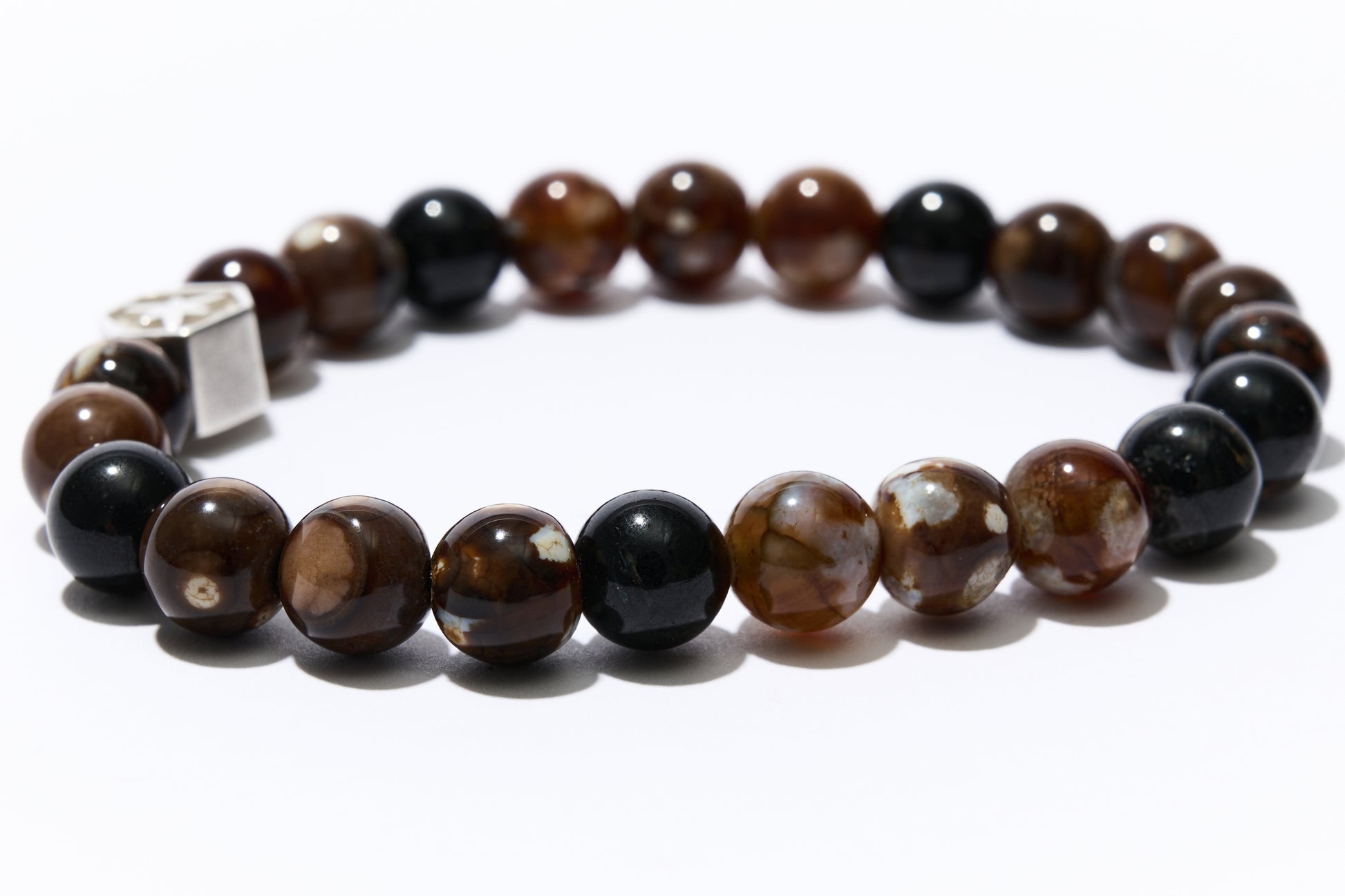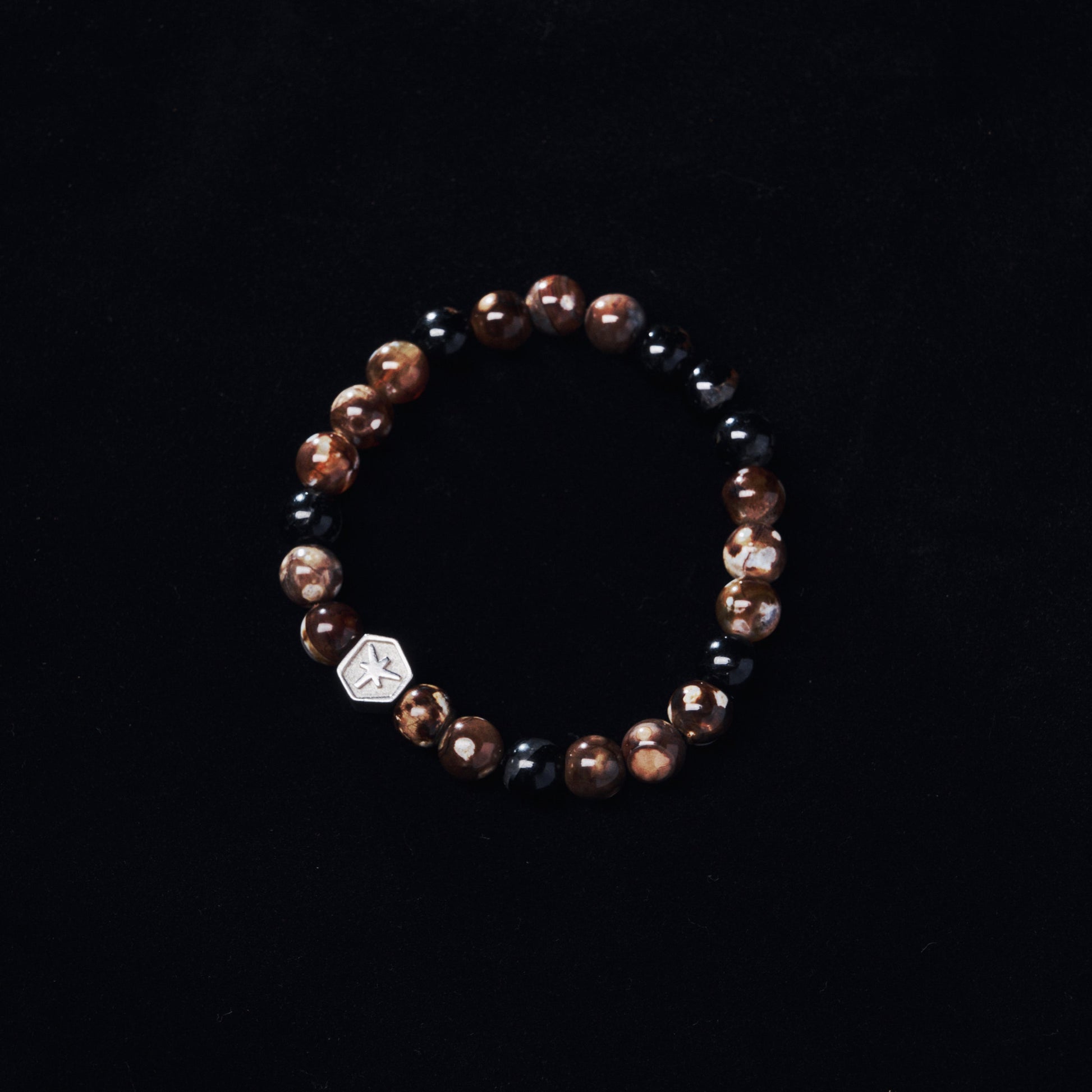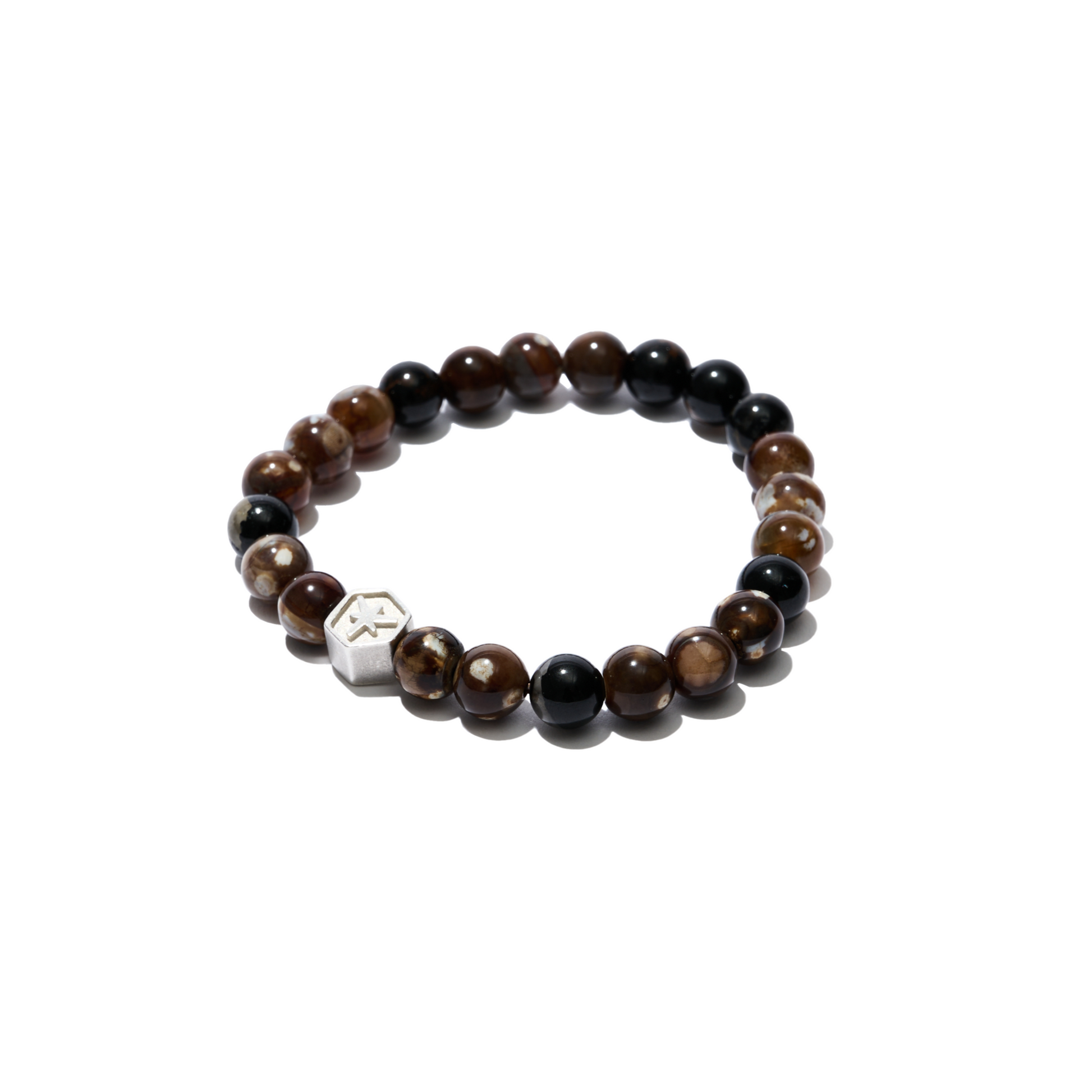 材質:棕色狂紋瑪瑙、黑碧璽水晶共生礦、Mountopia 北極星標誌 925銀飾、彈性絲線
