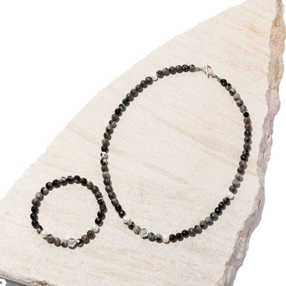 火焰石如夜幕中的流焰,閃耀堅韌與生命力;瑪瑙如深海的浪潮,散發冷靜與安定。天然珍珠點綴其中,映照出柔和而平衡的光澤