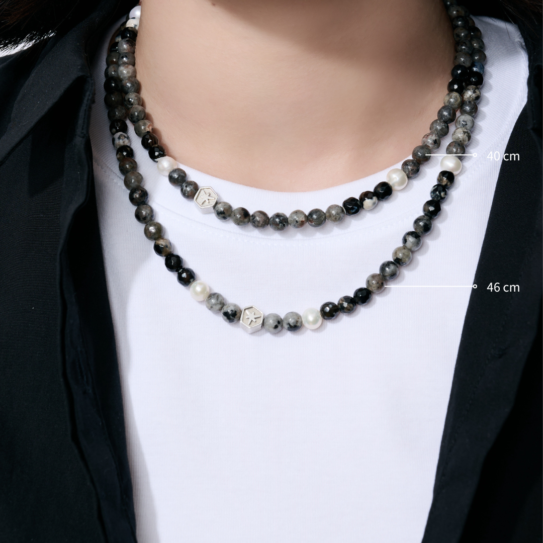 材質:火焰石、天然珍珠、藍白海紋瑪瑙、925 silver、鋼絲線