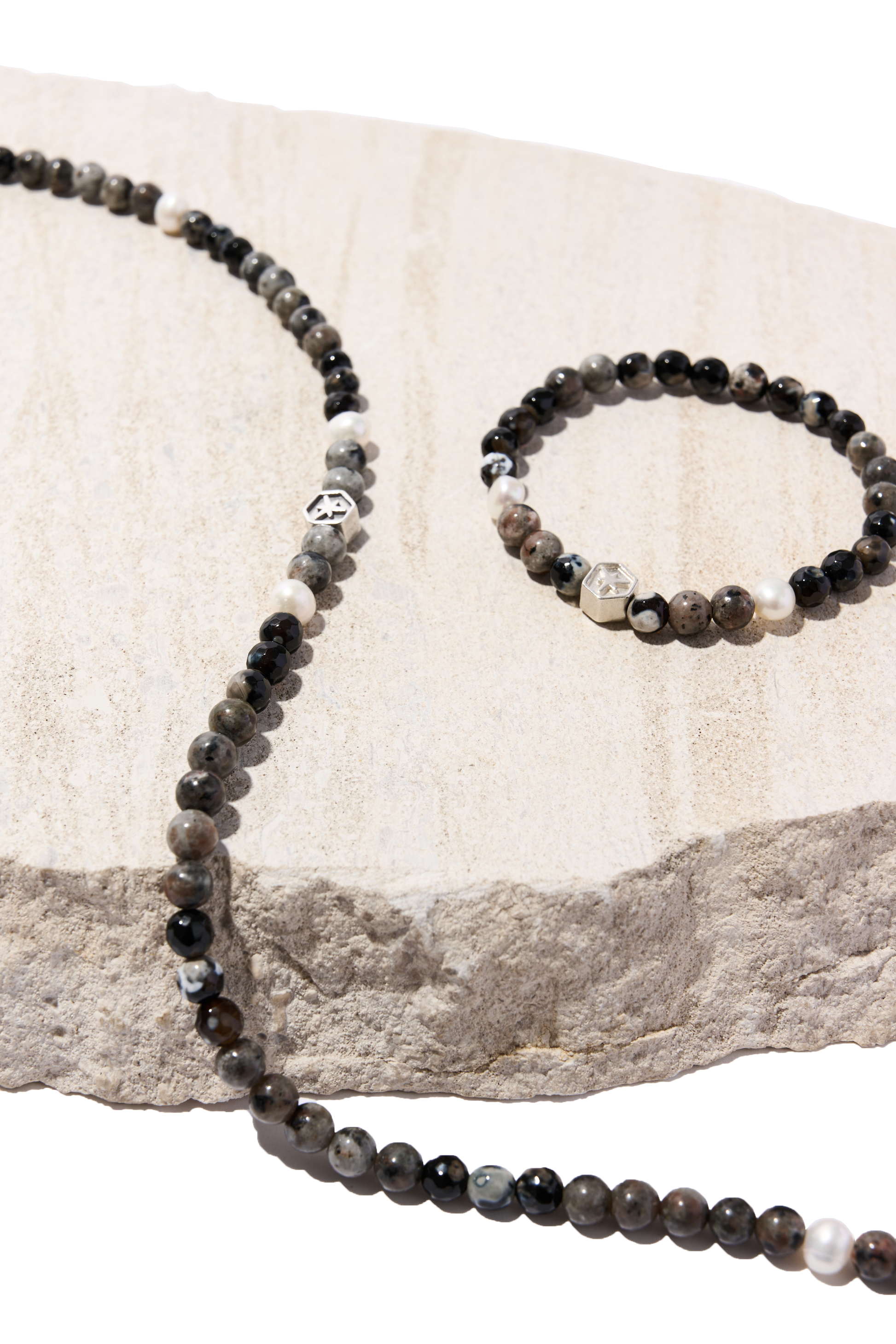 夜幕低垂烈焰依舊閃耀——這是一顆燃燒於暗夜之中的星球,火光閃爍,映照著堅韌與生命力。火焰石如熾熱流焰,點燃內在熱情與勇氣,賦予行動力與決心;珍珠則如靜謐月光,在烈焰之間調和平衡,使能量流動更顯和諧。藍白海紋瑪瑙宛如深海浪潮,為心靈帶來冷靜與穩定,平衡火元素的強烈動能。