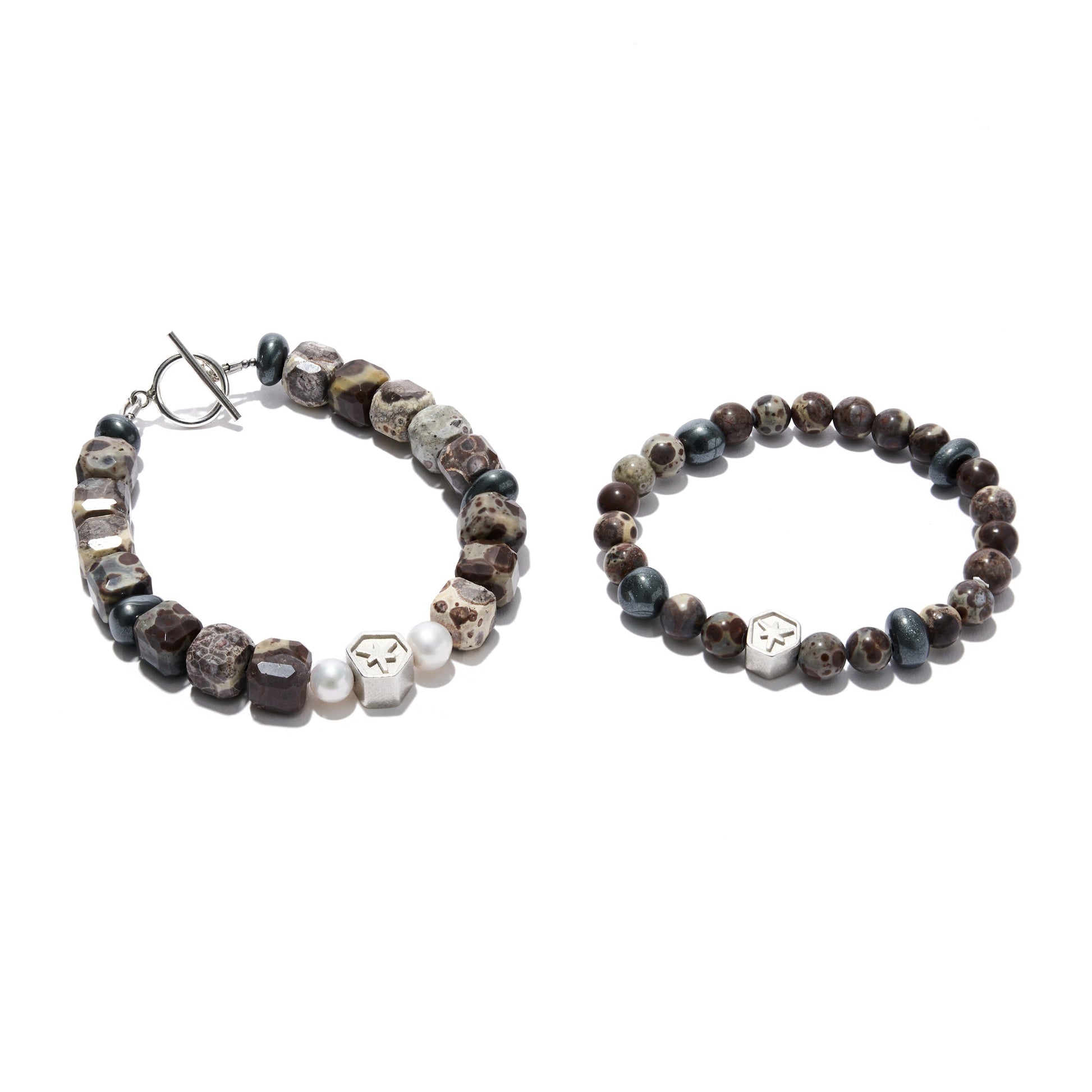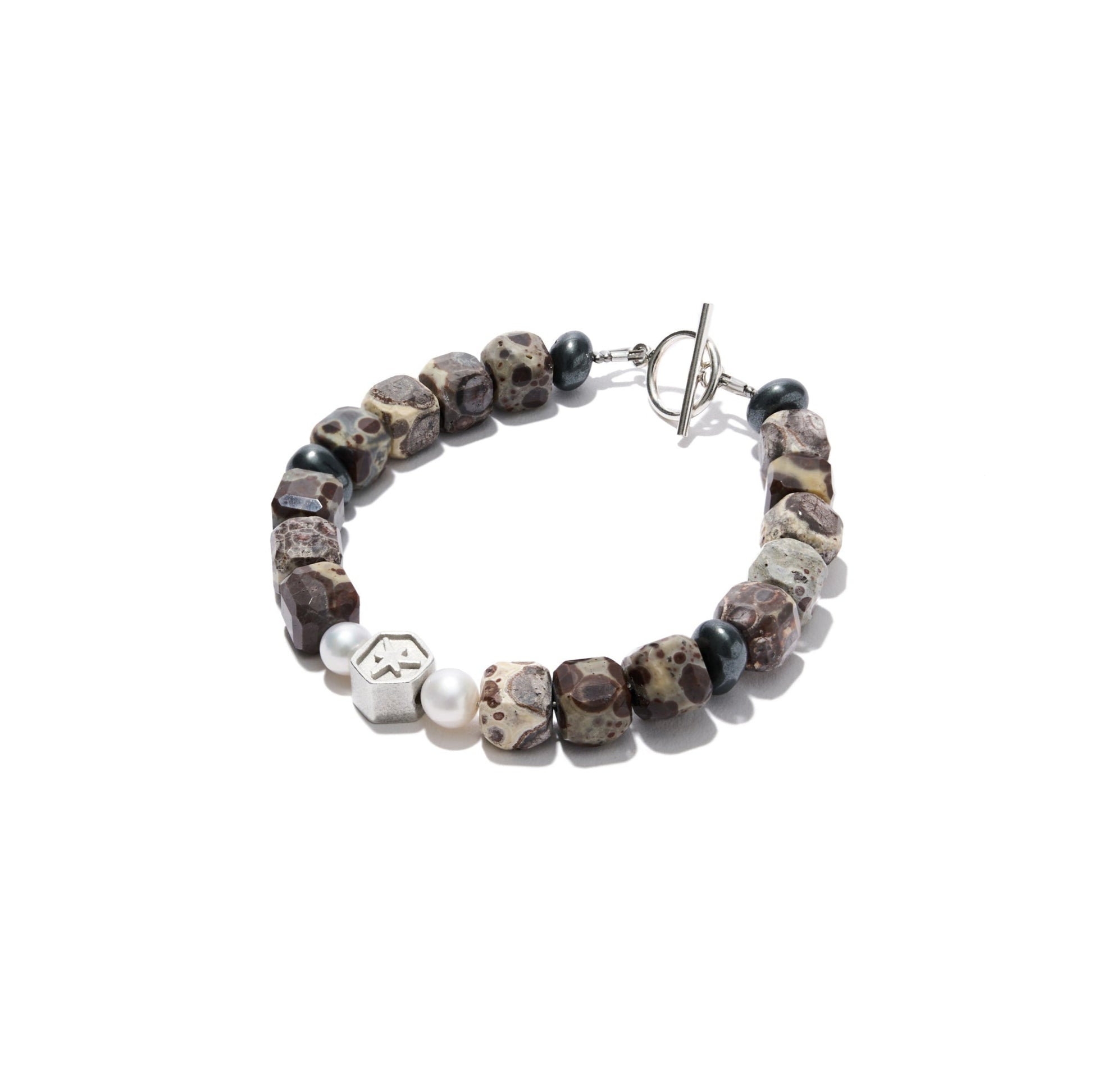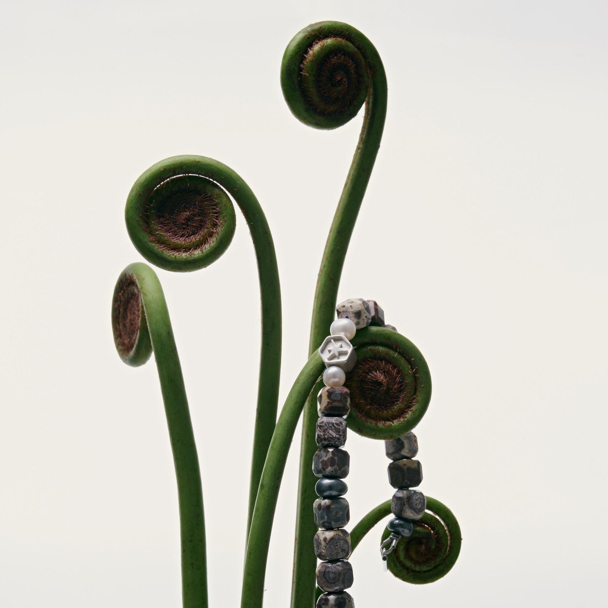星點碧玉浮現紅褐與灰白的斑駁圈點,宛如古老星圖的縮影。以立方體開窗設計結合隨形赤鐵礦與珍珠,彷彿步入籠罩謎霧的高地幻境