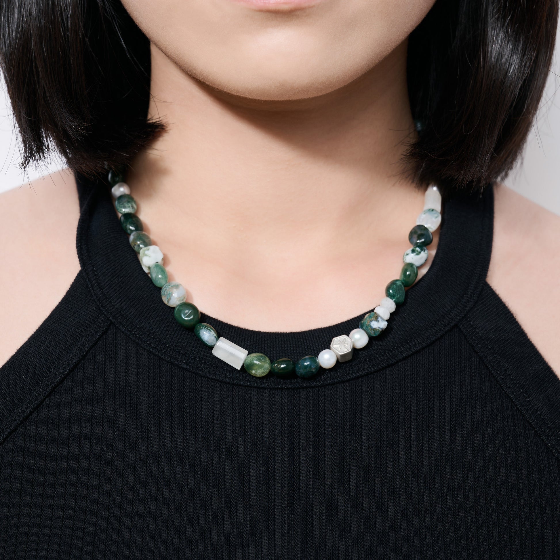 水草瑪瑙的紋理,如同沉睡湖底的柔軟植體,靜靜舒展於石中。以珍珠與月光石點綴,彷彿深夜湖面上的星點與月亮倒影,構築出一幅靜謐卻生機盎然的夜之地景