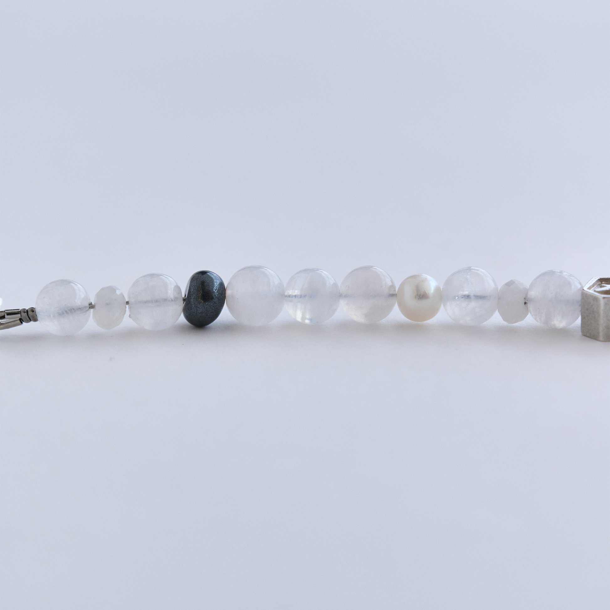 帶有藍暈的月光石散發朦朧光彩,與天然珍珠的柔和光澤交織,宛如月色灑落海面,微波閃動,帶來安然而靜謐的氛圍