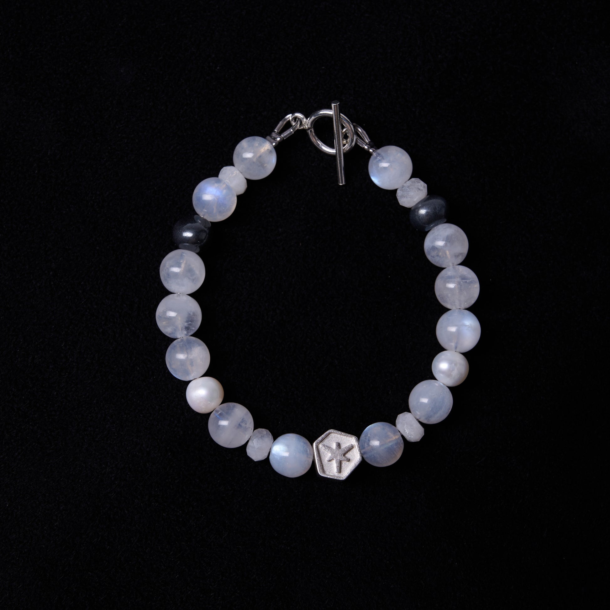 材質:月光石、淡水珍珠、赤鐵礦、Mountopia 北極星標誌 925銀飾、鋼絲線
