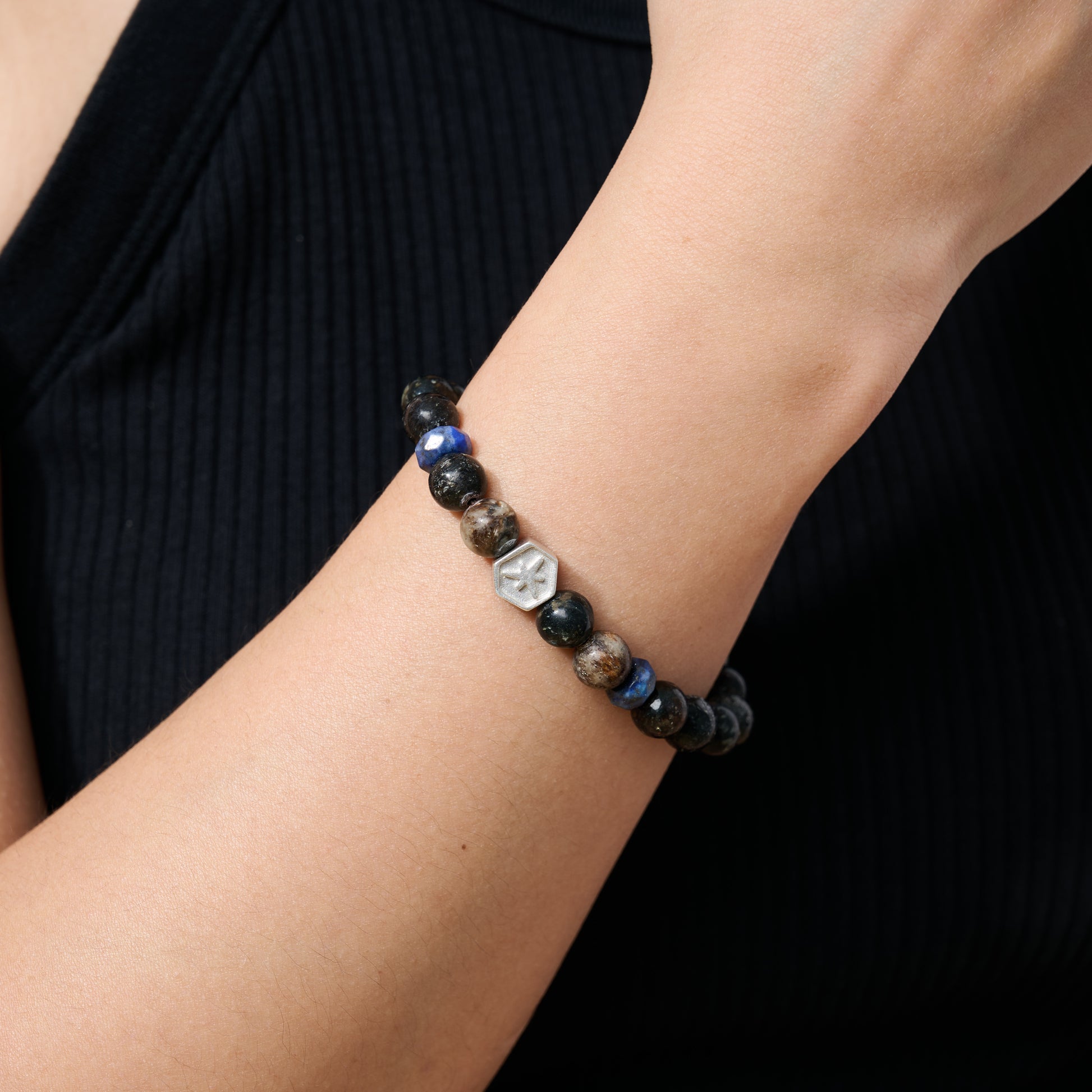 材質:金雲母、青金石、Mountopia 北極星標誌 925銀飾、彈性絲線